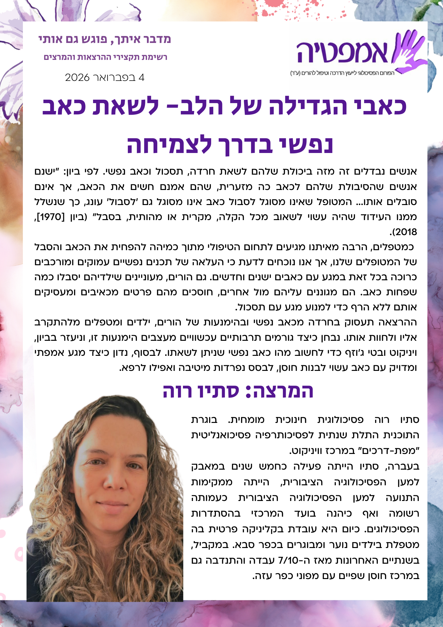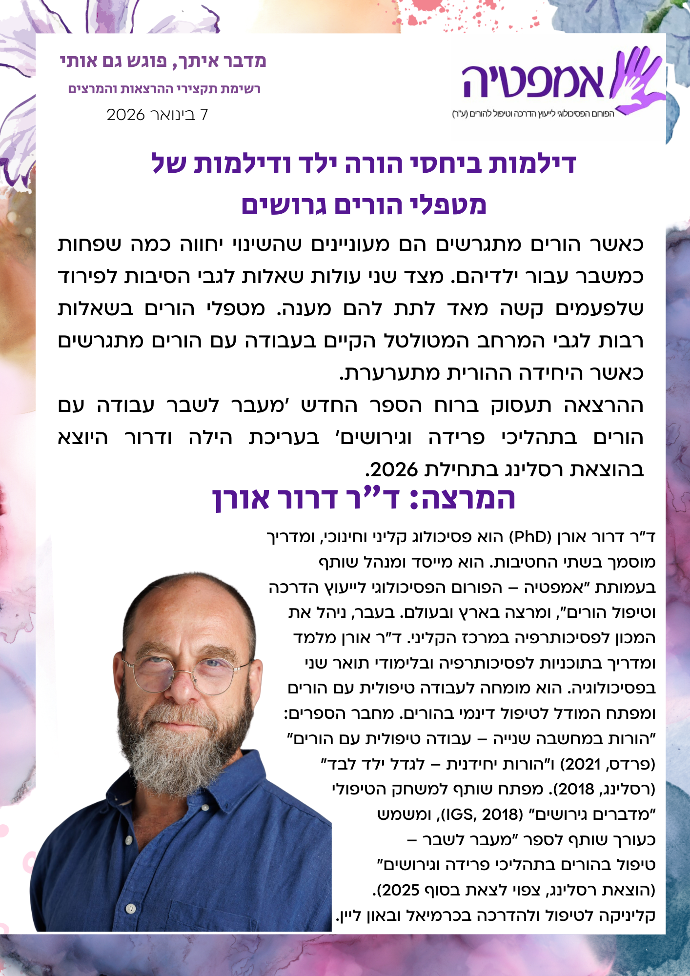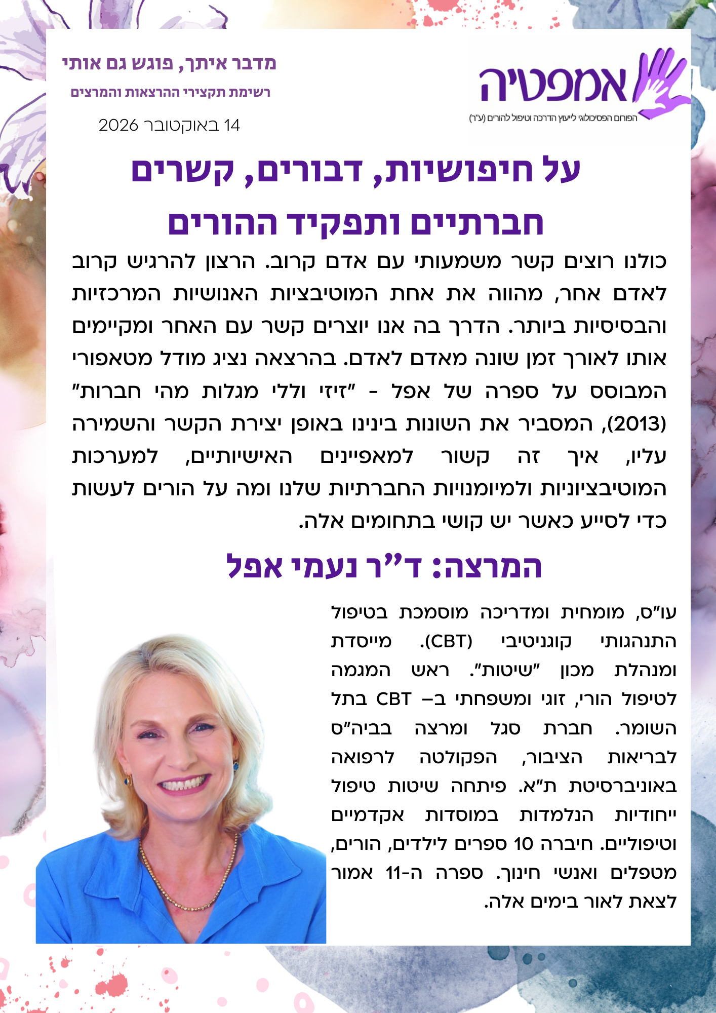 השתלמות"מדבר איתך פוגש גם אותי" של עמותת אמפטיה מפגישה את מטפלי ההורים ואנשי המקצוע עם מגוון זוויות עכשוויות בנושא.